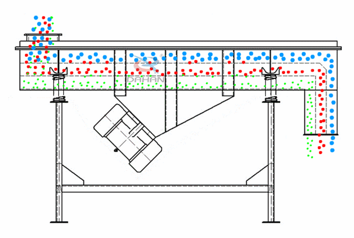 黃豆直線篩采用雙振動電機驅動,當兩臺振動電機做同步、反向旋轉時,其偏心塊所產生的激振力在平行于電機軸線的方向相互抵消,在垂直于電機軸的方向疊為一合力,因此篩機的運動軌跡為一直線。兩電機軸相對篩面有一傾角,在激振力和物料自重力的合理作用下,進入設備的物料在篩面上被拋起、跳躍式向前做直線運動,通過多層篩網產生數種規格的篩上物、篩下物,分別從各自的出料口排出,達到篩選和分級的目的。