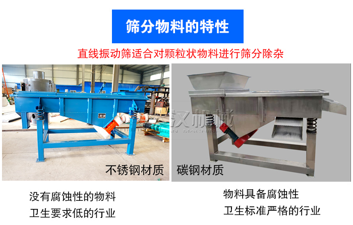 1)不同用戶選用的篩分物料不同,所以在選擇直線振動篩時需要參考物料特性。如果您篩分的物料具備腐蝕性,此時不能選擇普通碳鋼材質的直線振動篩,需要采用不銹鋼直線振動篩,而且針對有嚴格衛生標準的行業,如:食品,醫藥等行業,也需要選擇不銹鋼材質的直線振動篩。