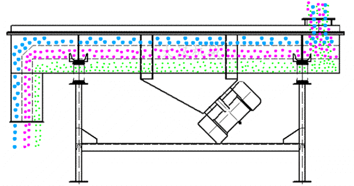 食品直線振動(dòng)篩結(jié)構(gòu)主要由篩箱、篩框、篩網(wǎng)、振動(dòng)電機(jī)、電機(jī)臺(tái)座、減振彈簧、支架等組成。采為雙振動(dòng)電機(jī)驅(qū)動(dòng),當(dāng)物料從給料機(jī)均勻地進(jìn)入篩分機(jī)的進(jìn)料口時(shí),兩臺(tái)電機(jī)通過(guò)同步、反向旋轉(zhuǎn)時(shí)所產(chǎn)生的激振力在平行于電機(jī)軸線的方向相互抵消,在垂直于電機(jī)軸的方向疊為一合力,在激振力和物料自重力的共同作用下,使物料在篩面上被拋起向前作直線運(yùn)動(dòng),物料通過(guò)多層篩網(wǎng)產(chǎn)生數(shù)種規(guī)格的篩上物、篩下物,然后又分別從各自的出口排出,從而達(dá)到篩分的目的。