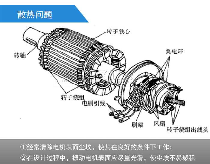 預(yù)防措施:①經(jīng)常清除電機(jī)表面塵埃,使其在良好的條件下工作;②在設(shè)計(jì)過程中,振動(dòng)電機(jī)表面應(yīng)盡量光滑,使塵埃不易聚積,如果在粉塵較大的環(huán)境下工作,應(yīng)考慮減去機(jī)殼表面的散熱筋,因?yàn)榇藭r(shí),散熱筋不僅起不到散熱作用,反而易使粉塵堆積,阻礙電機(jī)散熱。