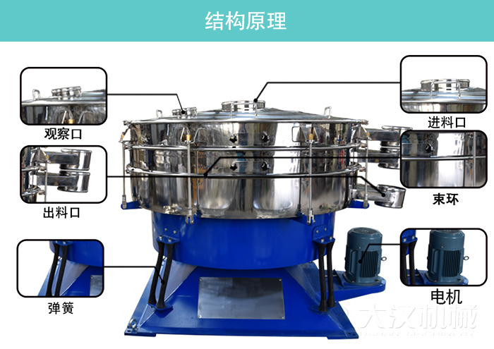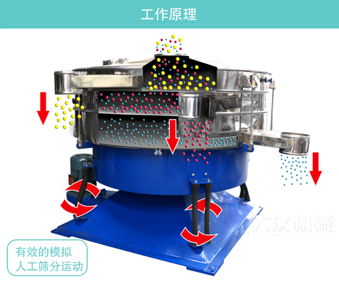 旋振篩,其原理是:瞬時(shí)運(yùn)動(dòng)為沿徑向的位移和以此位移為軸的圓周運(yùn)動(dòng)的合成(螺旋運(yùn)動(dòng))。即可調(diào)節(jié)偏心距的激振器產(chǎn)生了非線性三維運(yùn)動(dòng),物料也產(chǎn)生同樣的近似手動(dòng)作業(yè)的運(yùn)動(dòng),從而達(dá)到篩分之目的,再配合篩分附件可得到更加理想的篩分效果;適合于圓球狀、圓柱狀、片狀、乃至不規(guī)則形狀易堵網(wǎng)且需要精密篩分的物料。
